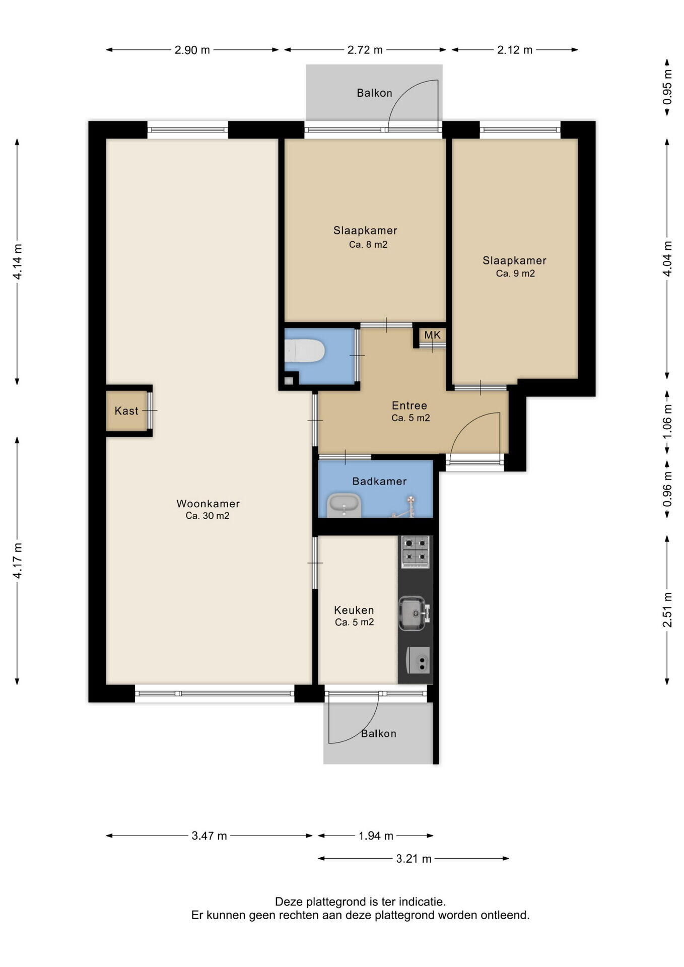 Entree in de hal met meterkast en toilet, gezellige lichte woonkamer (ca. 30m²), gesloten keuken (ca. 5m²) voorzien van standaard keukenblok, witgoedaansluiting en toegang tot een van de twee balkons. Vanuit de hal stap je in de beide slaapkamers (ca.9 en 8m²), waarvan één met toegang tot het tweede balkon. Hier is het heerlijk vertoeven met de eerste zonnestralen in de ochtend. De badkamer is voorzien van een douche en wastafel.
